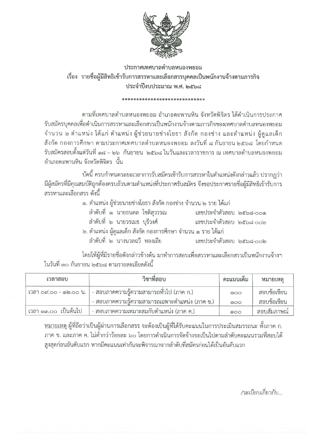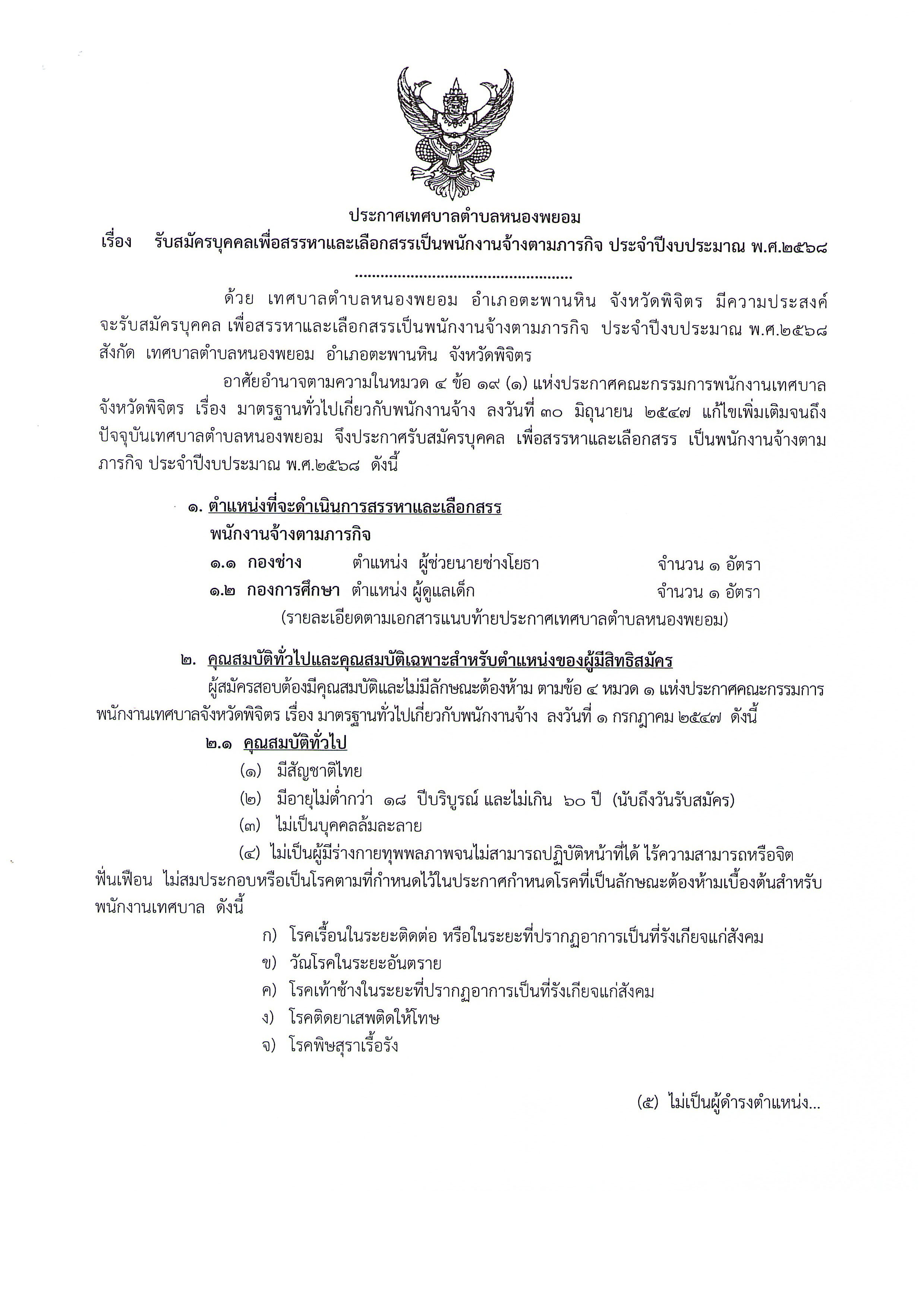 ประกาศเทศบาลตำบลหนองพยอม เรื่อง รายชื่อผู้มีสิทธิเข้ารับการสรรหาและเลือกสรรบุคคลเป็นพนักงานจ้างตามภารกิจ ประจำปีงบประมาณ พ.ศ.2568