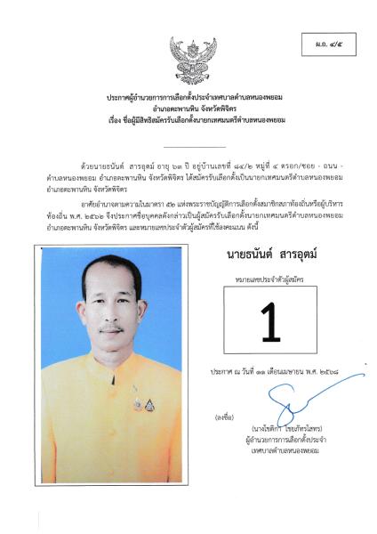 ประกาศผู้อำนวยการเลือกตั้งประจำเทศบาลตำบลหนองพยอม อำเภอตะพานหิน จังหวัดพิจิตร เรื่อง บัญชีรายชื่อผู้สมัครรับเลือกตั้งนายกเทศมนตรีตำบลหนองพยอมที่ได้รับสมัครรับเลือกตั้งและไม่ได้รับสมัครรับเลือกตั้งเขตเลือกตั้งที่ -