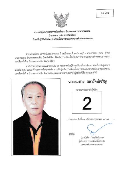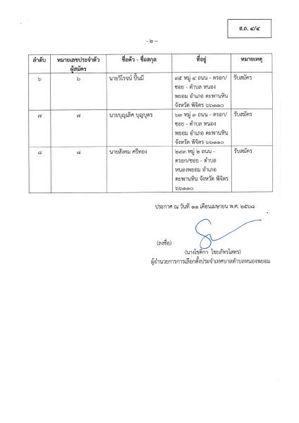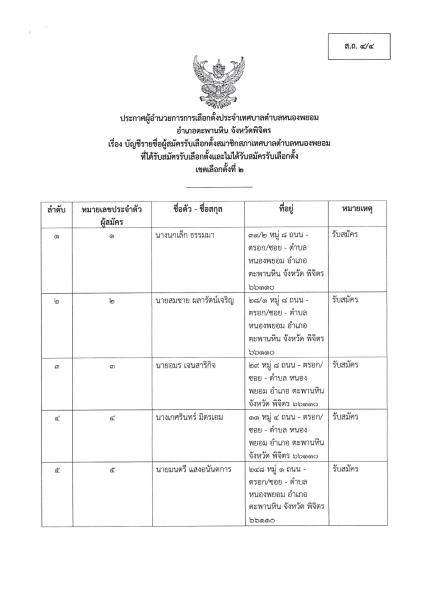 อำเภอตะพานหิน จังหวัดพิจิตร เรื่อง บัญชีรายชื่อผู้สมัครรับเลือกตั้งสมาชิกสภาเทศบาลตำบลหนองพยอมที่ได้รับสมัครรับเลือกตั้งและไม่ได้รับสมัครรับเลือกตั้งเขตเลือกตั้งที่ 2