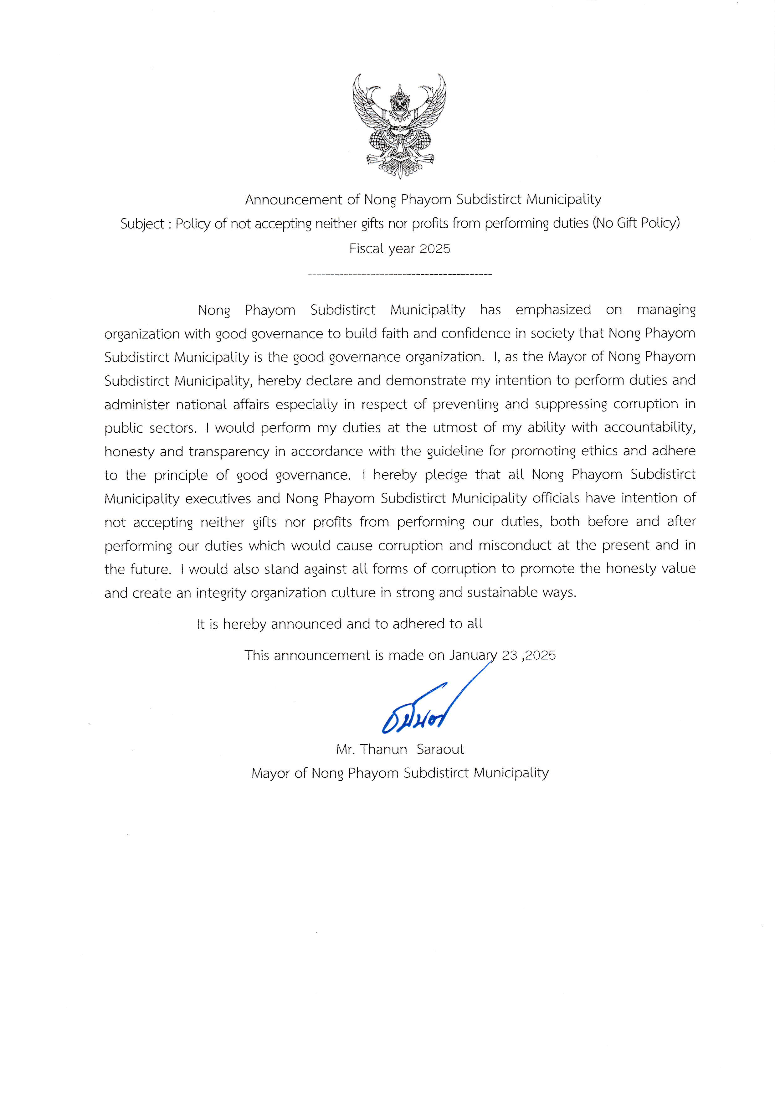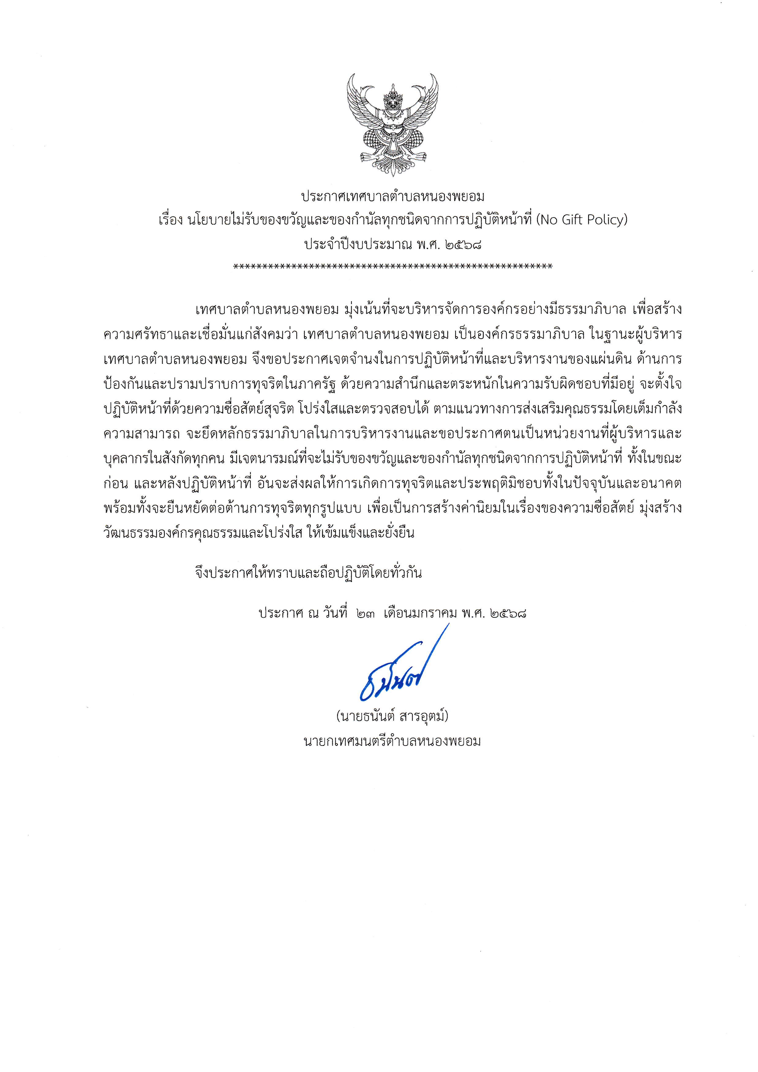 ประกาศเทศบาลตำบลหนองพยอม เรื่อง นโยบายไม่รับของและของกำนัลทุกชนิดจากการปฏิบัติหน้าที่ (No Gift Policy) ประจำปีงบประมาณ พ.ศ.2568