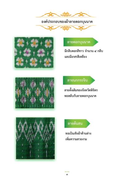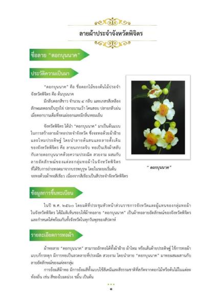 ลายนี้ได้รับแรงบันดาลใจจากต้นบุนนาค ต้นไม้ประจำจังหวัดพิจิตร ดอกบุนนาค มีกลีบดอกสีขาวและเกสรสีเหลือง มีลักษณะโดดเด่น คือ กลีบปลายบานเว้า โคนสอบ ดอกมีกลิ่นหอมเย็น เมื่อบานเต็มที่มีความสวยงาม ใช้เป็นต้นแบบลายผ้าทอ โดยผสมผสานกับลายอัตลักษณ์ท้องถิ่น เช่น ลายนกกระจิบ และลายต้นสน บนผืนผ้าฝ้ายและไหมประดิษฐ์ ทอด้วยกี่กระตุก และใช้สีประจำจังหวัดคือสีเขียว ซึ่งในปี พ.ศ. 2560 ลายดอกบุนนาค ได้รับการขึ้นทะเบียนเป็นลายผ้าอัตลักษณ์ของจังหวัดพิจิตร โดยกำหนดให้ประชาชนสวมใส่ผ้าลายดอกบุนนาคทุกวันพุธ เพื่อส่งเสริมการอนุรักษ์ผ้าไทยและภูมิปัญญาท้องถิ่น
