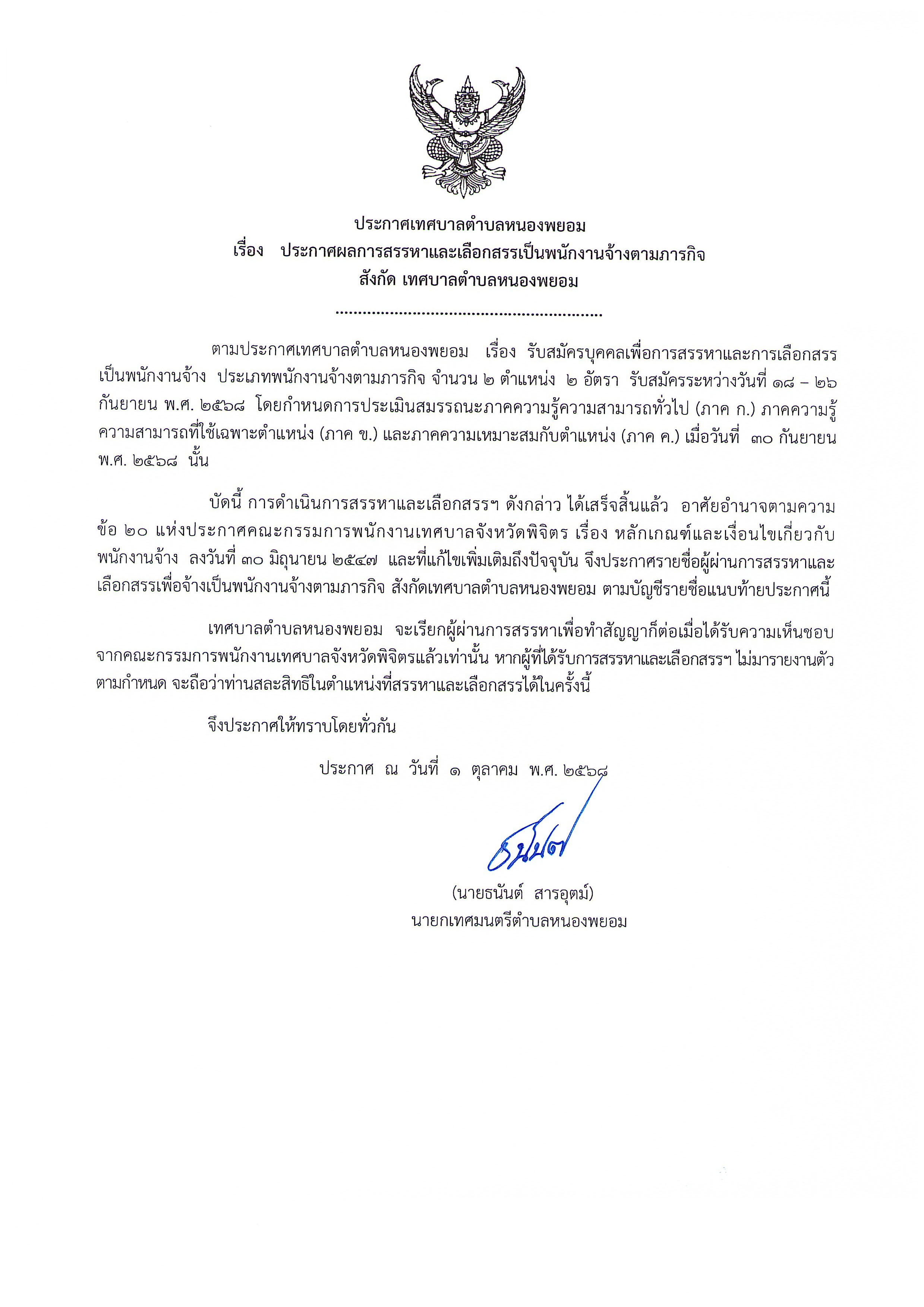 ประกาศเทศบาลตำบลหนองพยอม เรื่อง ประกาศผลการสรรหาและเลือกสรรเป็นพนักงานจ้างตามภารกิจฯ
