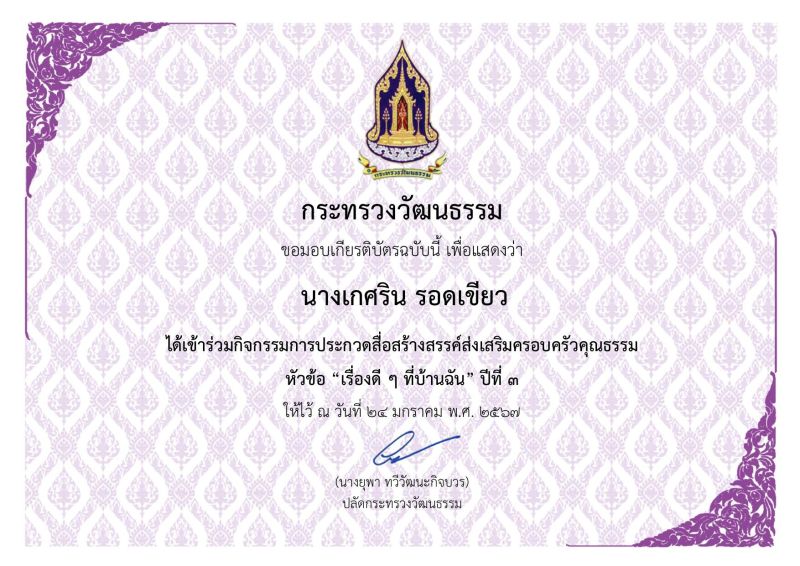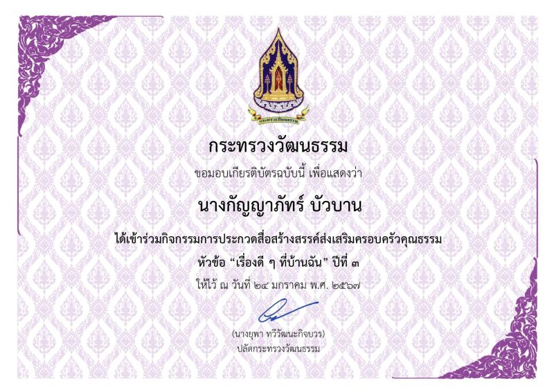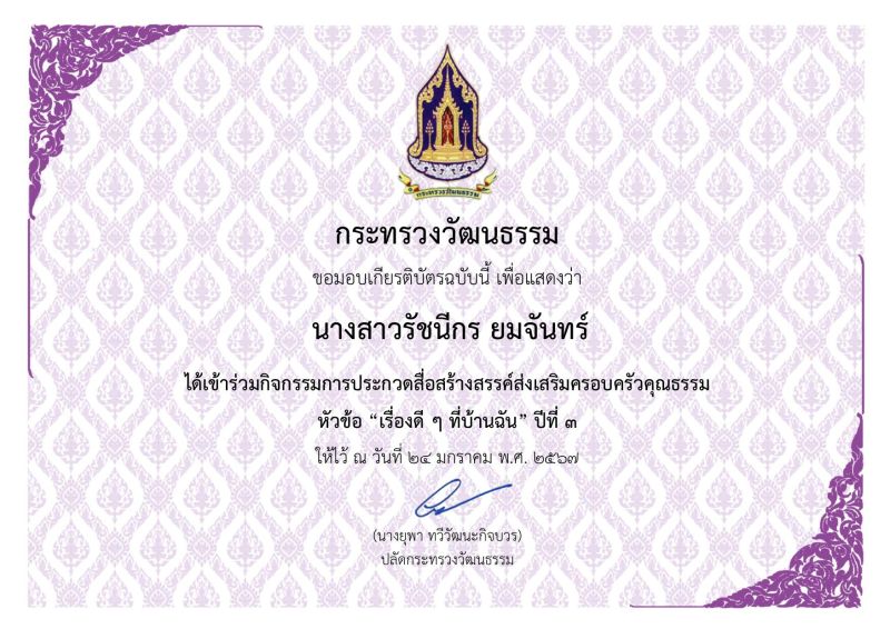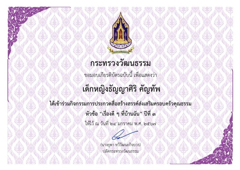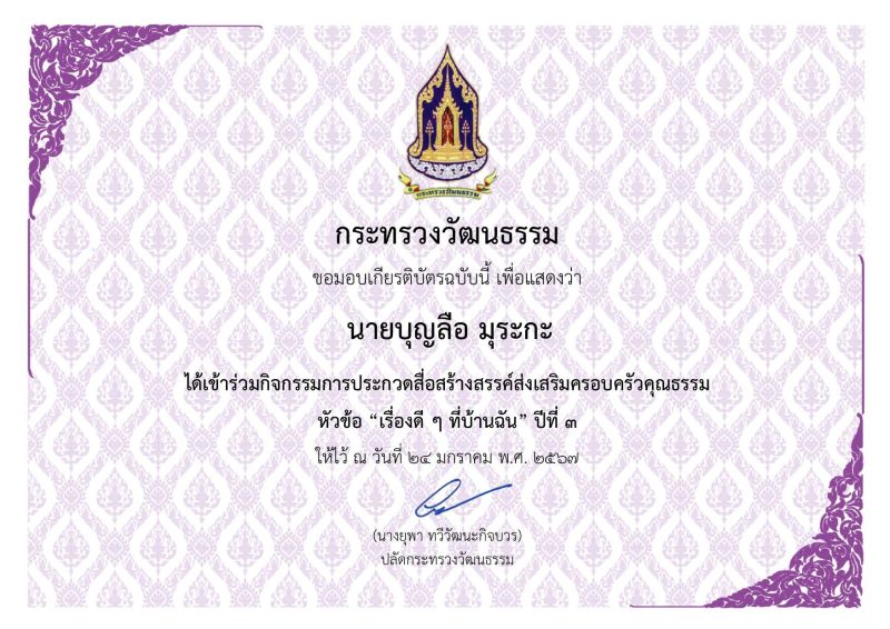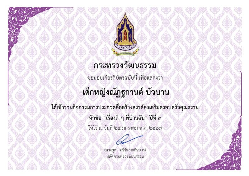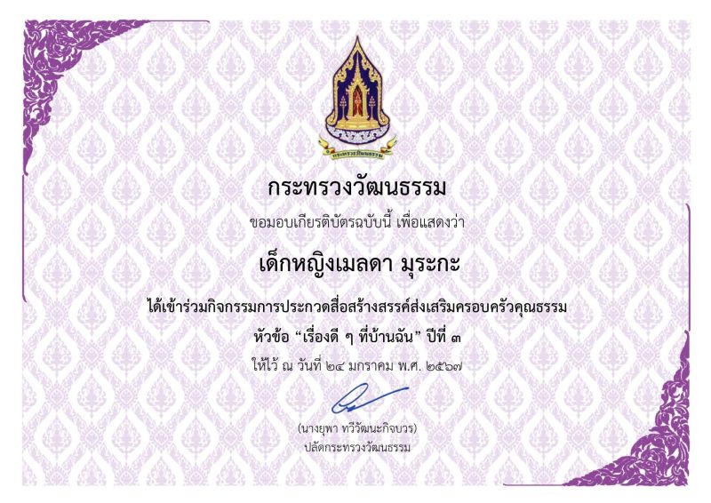 เรื่อง ขอประชาสัมพันธ์ผู้เข้าร่วมกิจกรรมการประกวดสื่อสร้างสรรค์ส่งเสริมครอบครัวคุณธรรม  หัวข้อ "เรื่อง ดีๆ ที่บ้านฉัน" ปีที่ 3 ดาวน์โหลดเกียรติบัตร