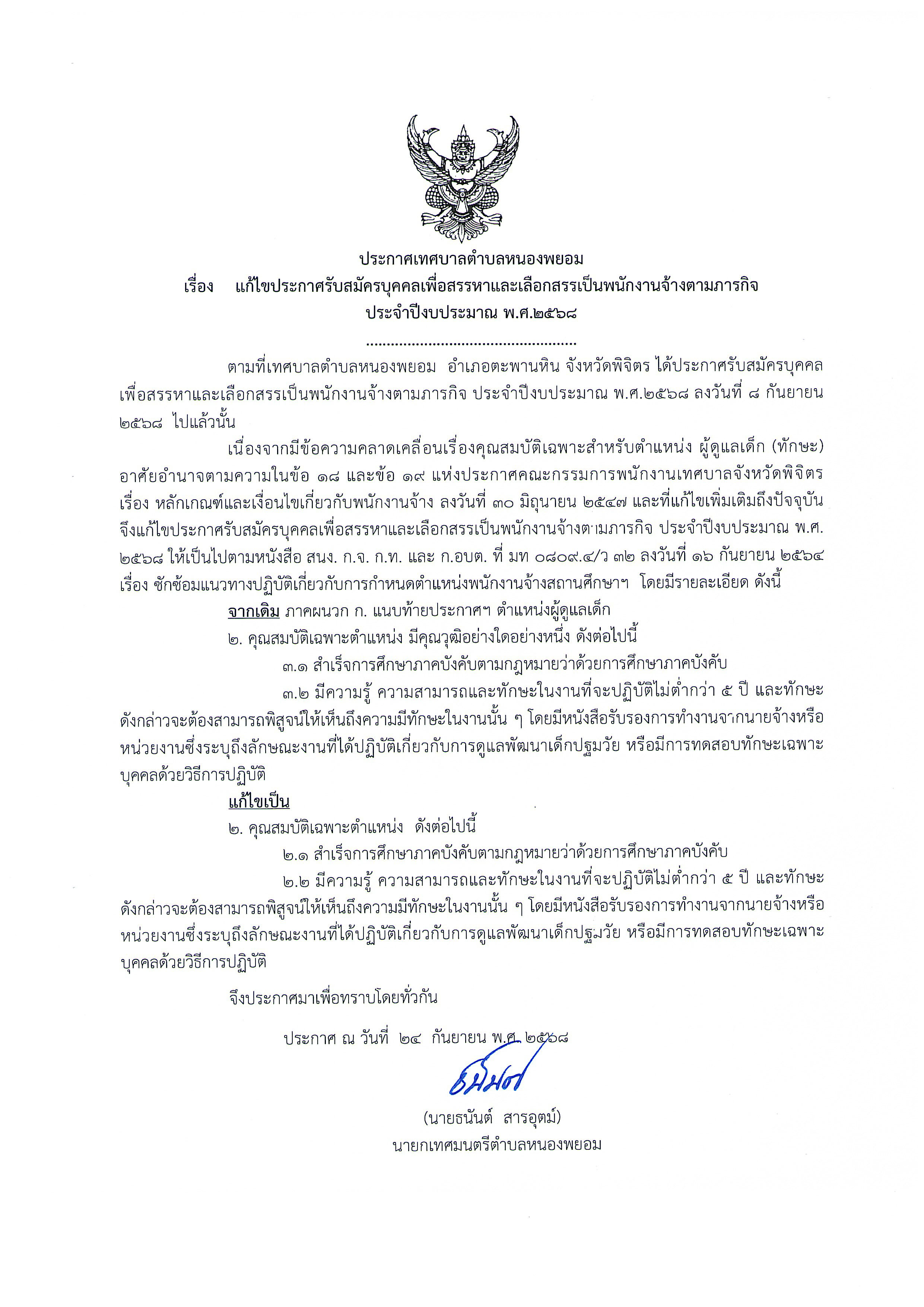 ประกาศเทศบาลตำบลหนองพยอม เรื่อง รับสมัครเพื่อสรรหาและเลือกสรรเป็นพนักงานจ้างตามภารกิจ ประจำปีงบประมาณ พ.ศ. ๒๕๖๘