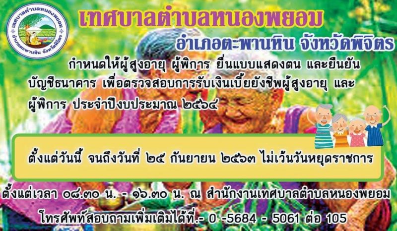ในการรับเบี้ยยังชีพผู้สูงอายุ และผู้พิการ ประจำปีงบประมาณ พ.ศ.2564 สำหรับผู้มีสิทธิรับเบี้ยยังชีพฯ ในเขตเทศบาลตำบลหนองพยอม (ทั้งรายเก่าและรายใหม่) โดยจะเปิดรับแสดงตนระหว่างเดือนสิงหาคม – กันยายน 2563 นี้