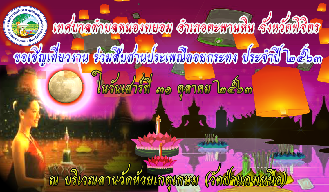 เทศบาลตำบลหนองพยอม ขอเชิญเที่ยวงาน ร่วมสืบสานประเพณีลอยกระทง ประจำปี ๒๕๖๓ ในวันเสาร์ที่ ๓๑ ตุลาคม พ.ศ. ๒๕๖๓