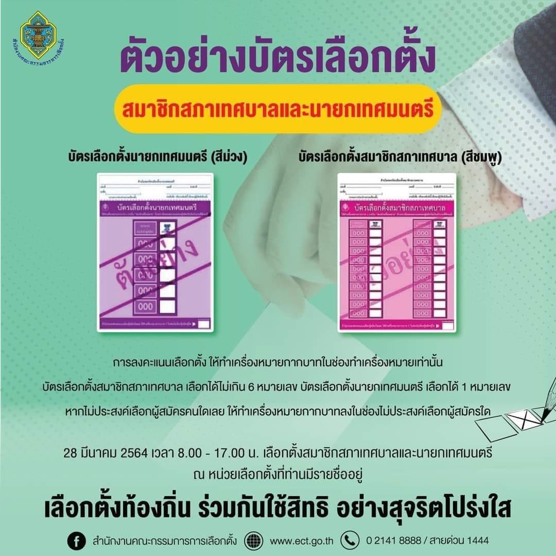 ตัวอย่างบัตรเลือกตั้งสมาชิกสภาเทศบาลและนายกเทศมนตรี ในวันอาทิตย์ที่ 28 มีนาคม 2564